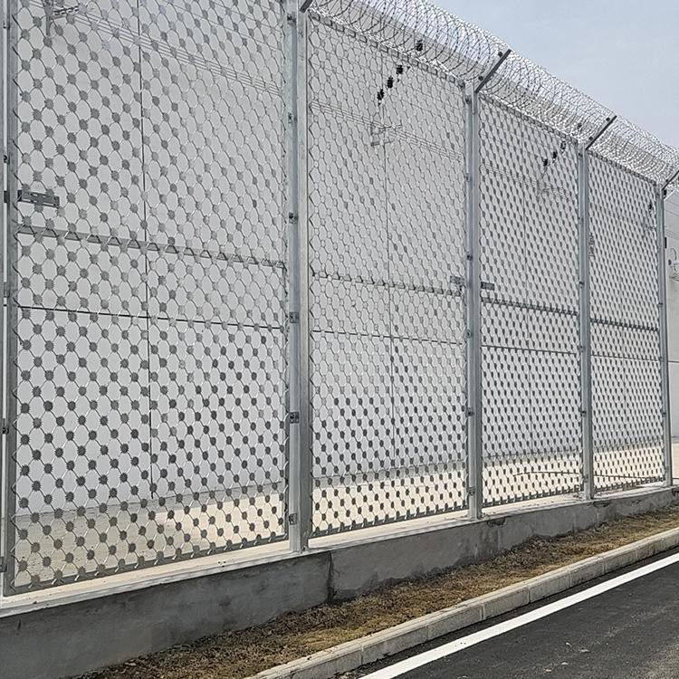 監獄梅花刺片隔離網立柱采用Y型鍍鋅鋼管、Y型立柱安裝不銹鋼刀片刺網,整體梅花監獄護欄網表面墨綠色噴涂、也常用銀灰色噴涂、高端大氣、既起到防腐防銹的作用、又有裝飾的效果。