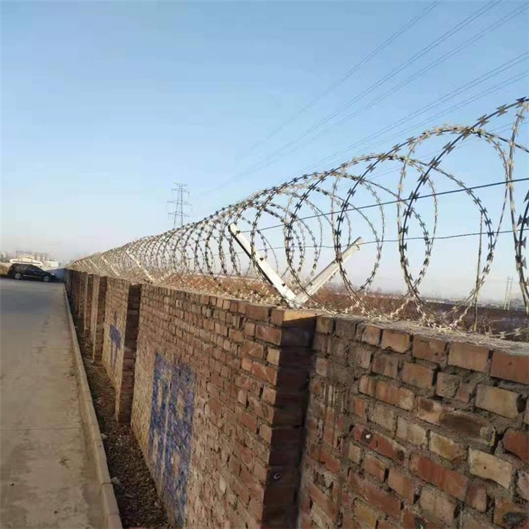 2、磚墻圍界刀片刺網安裝工藝磚墻頂部鉆孔→安裝支架→刺網安裝→刺圈網排放、拆包、接頭→安放至圍界頂部→精細調整→固定。