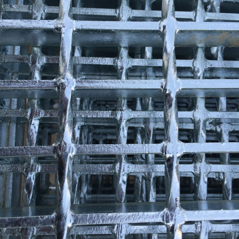 這是一種比較常見的連接方法,一般焊接格板4個點,基本上看可以固定一個踏步板,如果鋼格板經常有較重的重量,可以加幾個焊接點。焊接固定格柵板的方法簡單、牢固、經濟。但缺點是,在焊接時,會破壞鋼網鍍鋅層,焊接部位容易生銹,一般我們用噴漆簡單地補上。焊接格柵板一般用于長期使用,一般不易經常拆卸。