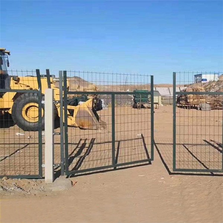 鐵路橋墩圍欄生產方式為冷拔鋼絲點焊熱鍍鋅再熱浸塑網片,外型尺寸為2760*1790mm,網格尺寸為75*150mm,鋼絲為φ4mm , 網片邊框采用30*50mm的方管焊接而成,防盜螺栓的螺柱、螺帽、墊圈等作熱鍍鋅處理。鐵路柵欄網片表面采用熱浸塑處理,顏色為墨綠色,整個結構表面平整光滑,色澤均勻,無漏鍍、開裂、脫皮及脫落等缺陷。網片浸塑所用的材料及PE表層環保性好,無污染。網片上方加裝蛇腹形滾刀網,有效的防止攀爬。