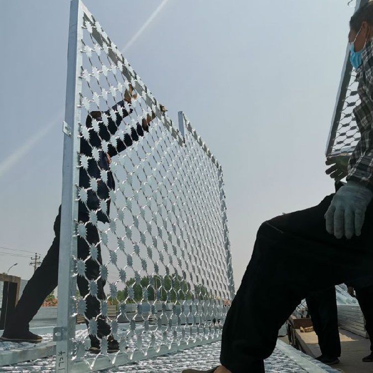 4.V型頂端安裝刀片刺網,直徑采用50cm-60cm刀片刺網主要是由熱鍍鋅鋼板或不銹鋼薄板沖壓而成的,它擁有尖銳的刀片,高張力鍍鋅鋼絲或者不銹鋼絲做芯線組合而成的產品。