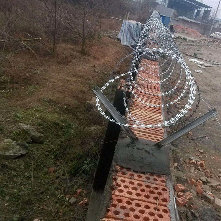 把V型支架固定在墻的上面,其間Y型支架可依據(jù)實(shí)際狀況進(jìn)行打孔,然后裝置刺網(wǎng)的時(shí)分,起到固定效果。之后,在刀刺網(wǎng)的Y型支架兩邊各拉一根鋼絲,對(duì)刺網(wǎng)進(jìn)行固定,避免左右晃。裝置刀片刺繩的時(shí)分要留意的事項(xiàng)也是許多的,可是要留意的是本身安全,因?yàn)榈镀汤K刀口規(guī)劃的原因遭到割傷后創(chuàng)傷欠好愈合,所以在裝置時(shí)要先保證本身的安全。一副比較厚的勞保手套是必不可少的,因?yàn)橹翱蛻舴从尺^說用一般手套成果割破了兩雙,所以為了維護(hù)我們的雙手遭到不必要的損傷,必定要帶好手套避免受傷。其次刀片刺繩裝置時(shí)需求兩個(gè)人一起進(jìn)行裝置避免一 個(gè)人 裝置時(shí)因?yàn)榛貜棇?dǎo)致受傷。裝置時(shí)必定要慎重切不可煩躁避兔因?yàn)槭韬龆竦綋p傷。