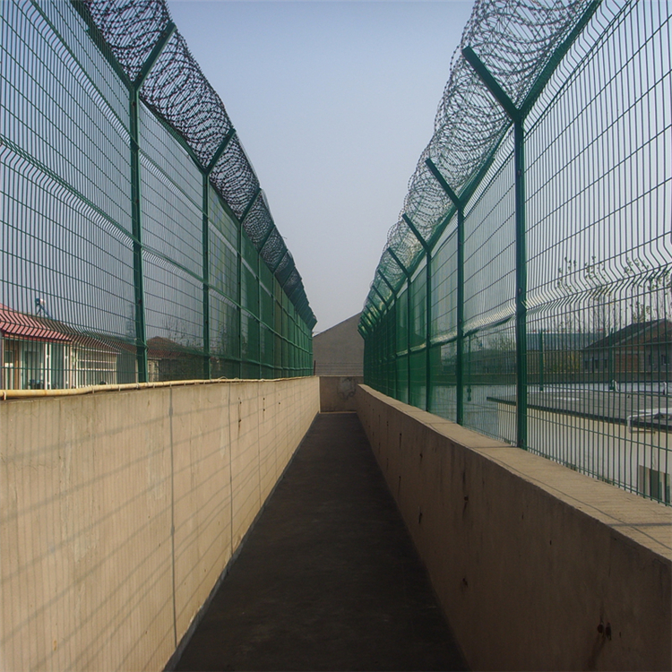 監獄鋼網墻又稱作“Y型安全防御護網”,是由V型支架立柱,加強型焊接片網,安全防盜連接件和熱鍍鋅刀片刺籠組成。無論是強度還是安全級別都很高。近年來,被廣泛應用在監獄,軍事基地等高安全場所。表面處理采用電鍍、熱鍍、噴塑、浸塑等防腐形式,具有很好的防老化、防曬、防候等特點。其產品造型美觀、花色多樣,既起到圍欄作用,又起到美化作用。焊接網鋼網墻具有安全性高、防攀爬能力好,防盜連接件,有效防止了人為的破壞性拆卸,橫向加強彎和橫撐的設計使網面強度顯著增加。