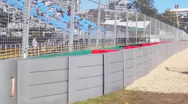 在護欄的選擇和擺放上,撞擊角度是我們需要考慮的重要因素之一,我們可以把賽車的能量分解到兩個方向上,平行于護欄的和垂直于護欄的。分解其中一個方向的能量,我們可以盡量避免護欄的形變并強迫賽車沿圍墻滑行,用摩擦力使其減速。混凝土護墻就極其適合這種情況,因為它堅固且不易移動,而車手也不會想正面撞上混凝土,所以它雖然不適合吸收垂直方向上的能量,但它很適合利用摩擦力吸收動能,分解掉水平方向的能量。