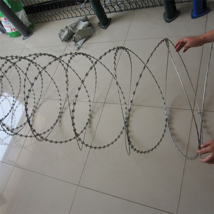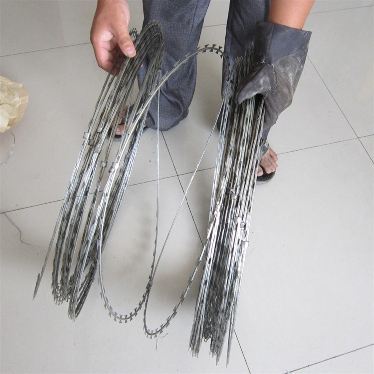 它采用鋼板(刀板)沖壓成型包附于熱鍍鋅鋼絲(芯線)之上,由銳利尖角鍍鋅鋼板或不銹鋼薄板做刀片,高張力鋼絲做芯線組合而成的。