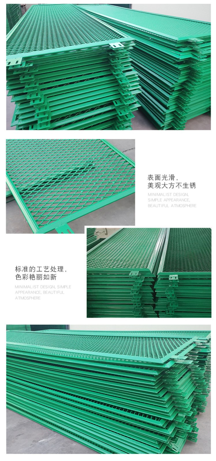 9、公路防眩網護欄靜電噴涂的外表,使圍欄產品具有杰出的自潔功用,雨水沖刷和水槍噴洗即可光潔如新。