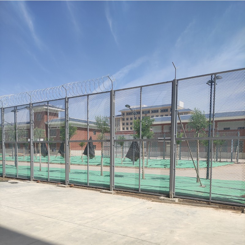 這個是大家常見的無論在是電視上還是電影上,這是必須要加裝刀刺網的,監獄通透式鋼網墻其實有大部分是指外部墻頂防護。